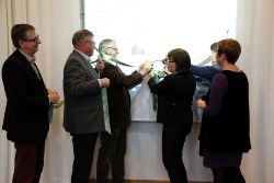 Efter Eva Berglunds presentation samlas kommunalråden från de fem kommunerna vid en ring i vilken de knyter var sitt band symboliserade kommunernas utfästelse om samverkan kring miljöarbetet. Samtliga ser glada och inspirerade ut och processen löper utan problem.