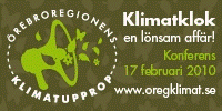 Klimatklok - en lönsam affär! - konferens för näringslivet 17 feb 2010. Välkommen till en fullmatad dag där det "klimatkloka företaget" står i fokus. Regionala och externa företag berättar om hur man sparar pengar och miljö samt stärker sitt varumärke genom energieffektiviseringar, modern teknik, IT-lösningar och ett synligt miljöarbete. Föreläsningar varvas med konkreta exempel och forum för erfarenhetsutbyte. Program med mer detaljer finns på hemsidan inom kort. Örebroregionens klimatupprop bygger på frivilliga klimatåtaganden bland näringsliv och organisationer i Örebroregionen. Målsättningen är att sänka koldioxidutsläppen och minska vår klimatpåverkan. Allt för att skapa bättre förutsättningar för kommande generationer. Därför uppmanar vi alla att delta - var och en efter sin förmåga. Välkommen till ett smörgåsbord av klimatsmarta verktyg & lönsamma arbetssätt! Mer information finns i bifogad inbjudan. Anmälan sker via Klimatuppropets hemsida, www.oregklimat.se. Vänliga hälsningar, Ankie Rauséus projektledare, Örebroregionens Klimatupprop, 0703-880 220, ankie@oregklimat.se Läs mer och anmäl er via vår webbplats www.oregklimat.se.