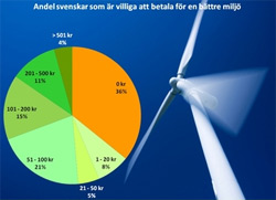 64 procent av svenskarna är villiga att betala ur egen plånbok om deras pengar gick till ändamål som bevisligen kunde minska utsläppen och bidra till en renare miljö. Detta är väldigt många. Även om man bortser från dem som enbart ville bidra med små summor (1-50 kr per månad) är vi fortfarande uppe i 51 procent av sveriges befolkning som vill investera pengar i minskade utsläpp. Dessa 51 procent är villiga att betala i genomsnitt 434 kr i månaden efter skatt för en renare miljö. Sammantaget utgör detta den formidabla summan 17,5 miljarder kronor per år, eller 0,68 procent av vår BNP.