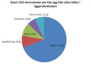Den allra största delen av äggens klimat- och miljöpåverkan sker vid foderproduktionen och på gården. Nästan 70 procent av klimatgaserna kommer från fodertillverkningen och runt 9 procent kommer vardera från uppfödningen av värphöns respektive från gården. Transporten av ägg från gården till packerier och butik står för knappt 5 procent av växthusgaserna från äggproduktionen. Se Diagram 1: