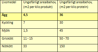 För att producera ett kilo ägg går det åt foder från i genomsnitt 4,5 kvadratmeter åkermark. Det är en tredjedel av den areal som krävs för att producera ett kilo griskött och knappt två tredjedelar av arealen för att producera ett kilo kycklingkött, se tabell 2: