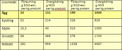 Ett kilo ägg ger det enskilt lägsta bidraget till försurningen och bidrar näst minst till övergödningen av sjöar och hav jämfört med andra animaliska livsmedel. Se Tabell 3. Den försurande verkan som äggproduktionen bidrar med kommer främst från utsläppen av ammoniak i samband med stallgödselhanteringen. Bidraget till övergödningen kommer främst från nitratläckage i foderodlingen, se tabell 3: