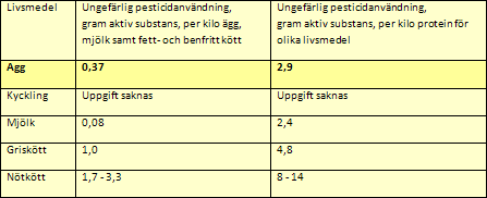 Tabell 4. Hönsens effektiva foderomvandling gör att det bara krävs 4,5 m2 för att producera ett kilo ägg. Därmed blir mängden bekämpningsmedel i foderproduktionen lägre för ett kilo ägg än för ett kilo kött. Även räknat per kilo protein vinner äggen över köttet. Källa: SIK och Livsmedelsverket.