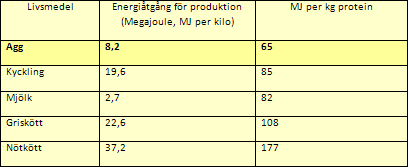 Den mängd energi som går åt för att producera ett kilo äggprotein är lägre än för alla andra animaliska livsmedel, 65 MegaJoul. Se Tabell 5: